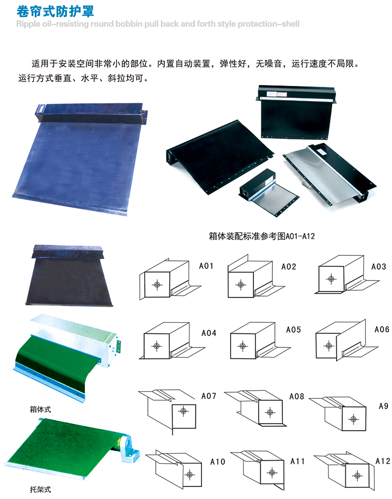 卷帘防护罩在空间小而且不需严密防护的情况下,卷帘防护罩可以代替其它护罩。可水平、竖直或任意混合方向上安装使用。占用空间小、行程大、速度快、无噪音、寿命长等,是一种理想的防护部件。