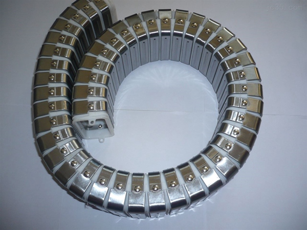 套板外经镀铬处理,和不锈钢及塑料,内有工程塑料增强尼龙66加纤维组合而成;结构合理,强度高、不变型、外型精美等优点。能随机床移动部件协调地运行,可延长被保护的电线、电缆、液、气软管的使用寿命,降低消耗,并大大改善了机床的电线、电缆、液、气软管分布零乱的状况,增强机床整体艺术造型效果。此护套即使在10,000,000次行程之后也不会出现故障或材料的疲劳。工作环境温度可持续在-40℃至+120℃之间,瞬间温度可达180℃。对冷却液有很好的抵抗能力。
