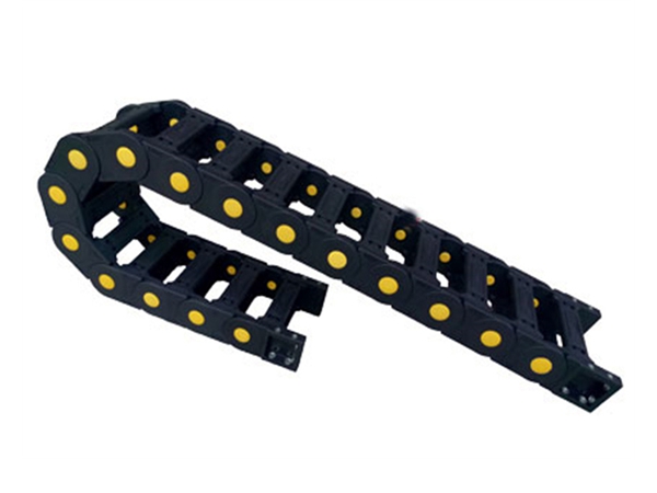 拖链外形似坦克链,由众多单元链节组成,链节之间转动自如。相同系列的拖链内高、外高、节距相同,拖链内高、弯曲半径R可有不同的选择。单元链节由左右链板和上下盖板组成,拖链每节都能打开,装拆方便,不必穿线,打开盖板后即可把电缆、油管、气管等放入拖链内。