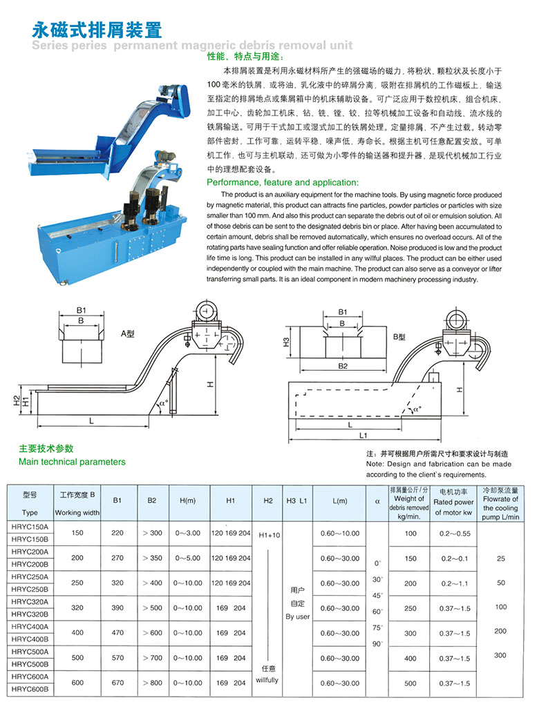 磁性排屑机利用永磁材料所产生的强磁场的磁力,将切屑吸附在排屑机的工作磁板上,或将油中、乳化液中的颗粒状、粉状及长度≤150毫米的铁屑吸附分离出来,输送到指定的排屑地点或集屑箱中。可处理粉状、颗粒状及长度小于100毫米的铁屑及非卷屑,或将油、乳化液中的碎屑分离,输送至指定的排屑箱中。