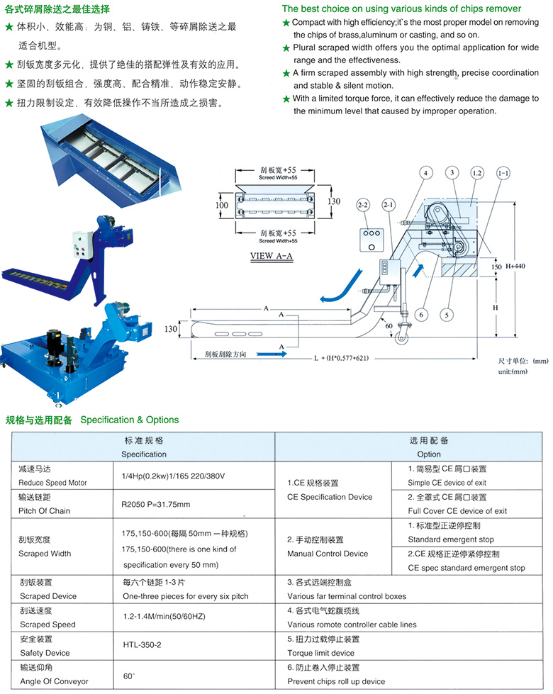 2、刮板排屑机适用于输送块状粉碎或粉状切屑,非常不适合含有纤维状长条型切屑的输送,否则会引起切屑缠绕链条。
