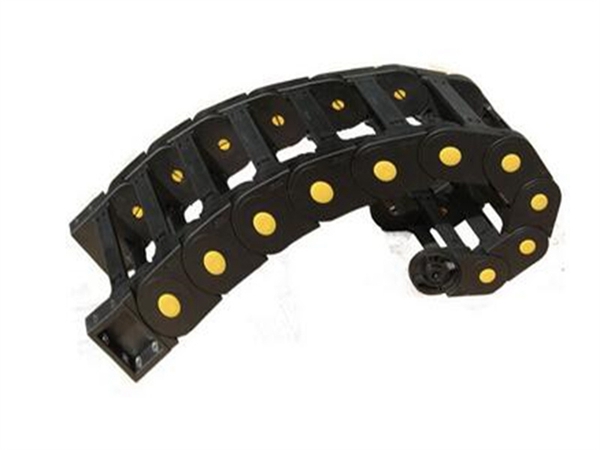 拖链外形似坦克链,由众多单元链节组成,链节之间转动自如。相同系列的拖链内高、外高、节距相同,拖链内高、弯曲半径R可有不同的选择。单元链节由左右链板和上下盖板组成,拖链每节都能打开,装拆方便,不必穿线,打开盖板后即可把电缆、油管、气管等放入拖链内。