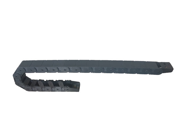 拖链外形似坦克链,由众多单元链节组成,链节之间转动自如。相同系列的拖链内高、外高、节距相同,拖链内高、弯曲半径R可有不同的选择。单元链节由左右链板和上下盖板组成,拖链每节都能打开,装拆方便,不必穿线,打开盖板后即可把电缆、油管、气管等放入拖链内。